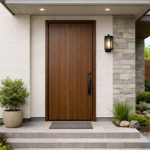 構造がシンプルなため、玄関枠・蝶番・錠前の納まりも安定しており、対応できる商品数やデザインの選択肢が非常に豊富です。そのため、価格帯も幅広く、コストとデザインのバランスを取りやすい玄関ドアといえます。