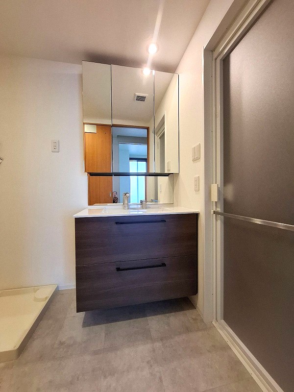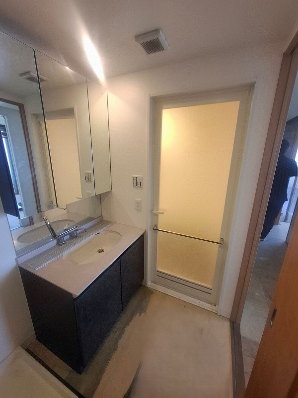 福岡市中央区の築21年マンションにて、洗面化粧台のリフォームを行いました。今回採用したのはTOTO【エスクアLS】です。扉色は落ち着いたロイダルブラウン、カウンターは清潔感のあるホワイトを選定し、空間全体が上品で明るい印象に生まれ変わりました。今回バックパネルは鏡タイプを採用し、洗面室に奥行きと広がりを演出。水がスムーズに流れる洗面ボウルは、泡や髪の毛をすべるように押し流す設計で、清潔な状態を保ちやすくなっています。さらにセミウェットエリアや一時置きスペースも備え、日々の使い勝手を高めています。キャビネットは床から浮いたようにデザインされており、足元がスッキリ見えて清掃性も向上。収納力もしっかり確保されているため、見た目と実用性を兼ね備えています。さらに床材も張り替えたことで、全体に統一感が生まれ、よりスタイリッシュで快適な空間となりました。今回のリフォームにより、デザイン性・清掃性・収納力を兼ね備えた洗面空間が実現しました。
