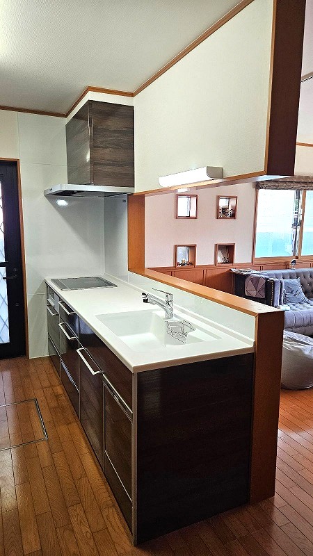 福岡県飯塚市の戸建住宅にて、タカラスタンダードのシステムキッチン「トレーシア(I型W2550)」を採用したキッチンリフォームを行いましたが、トレーシアは高品位ホーロー素材を活かした耐久性・清掃性の高さが大きな特長であり、油汚れや水ハネもサッと拭くだけでキレイを保てるため日々のお手入れ負担を軽減できる点が魅力です、今回のプランではチェスナットミディアムの落ち着いた木目扉にシルバーカラーを組み合わせることで空間に上質感と統一感を持たせ、ハンドシャワー水栓によりシンク作業の使い勝手も向上、さらにシンク下に45㎝タイプの食器洗い乾燥機を設置することで作業動線を崩さず効率的な家事を実現し、レンジフードにはシロッコファンタイプを採用することで静音性と吸引力を両立した快適な調理環境を整えました、既存空間の雰囲気を活かしながらも機能性とデザイン性を兼ね備えたキッチンへと生まれ変わり、日々の料理時間がより快適で心地よいものとなる住まいへと仕上がっています。